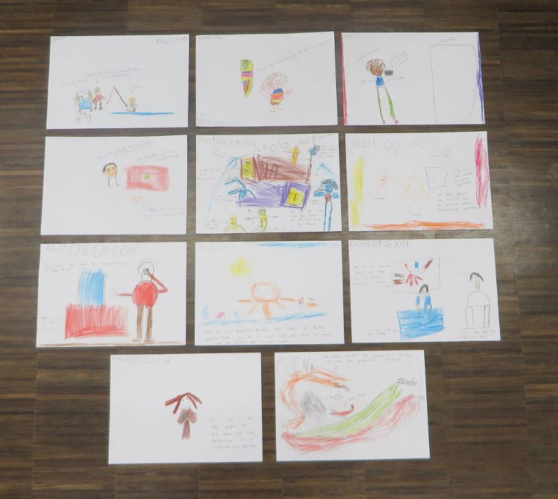 The excitement of the more or less 175 children was clearly visible when the entered the auditorium in the secondary school building. Hard to believe that these exact same children would be sitting on their chairs quietly and sort of enchanted only a few minutes later. The reason was the fascination of Maike Jansen playing the flute. From the beginning through the end of the 50 minute long show the children were capitivated. During the first scene a radiant smiling first grader turned to say “This is sooo funny” whereas a group of boys was expressing the admiration for Stefan Ferencz’s acrobatic skills when comparing him tio German soccer national team goal keeper Manuel Neuer. Whenever the little Erdvogel” vehemently exclaimed “I am an Ervogel” or “I want to fly” he was supported by a choir of children’s voices. But also the poetic and thoughtful moments did not go unnoticed but became visible in the pieces of arts and children reflecting on the theatre play. Pre-primary student Anita for example mentioned the stork who said “Flying is and art”.